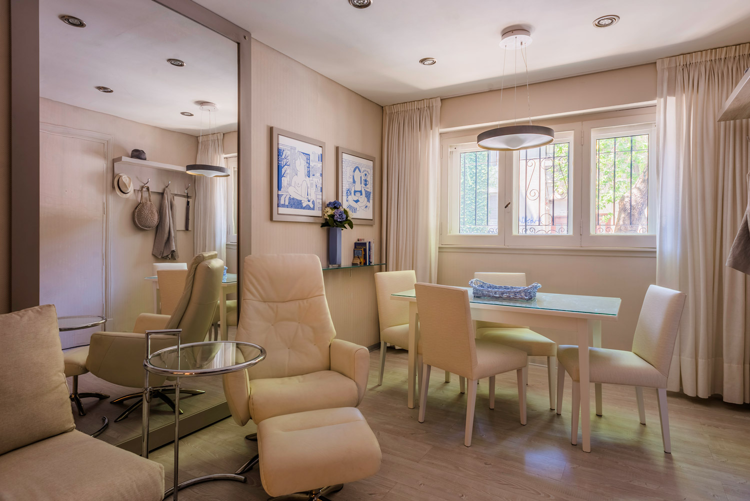 Espectacular y luminoso piso de categoría, de estilo vintage. Brinda amplitud suficiente para que algunos huéspedes se reúnan en el comedor diario, mientras otros se relajan en el estar principal o en la terraza, o prefieren descansar en los dormitorios. La decoración crea un clima cálido y acogedor que invita a apropiarse de cada espacio y disfrutarlo como si estuviéramos en casa.